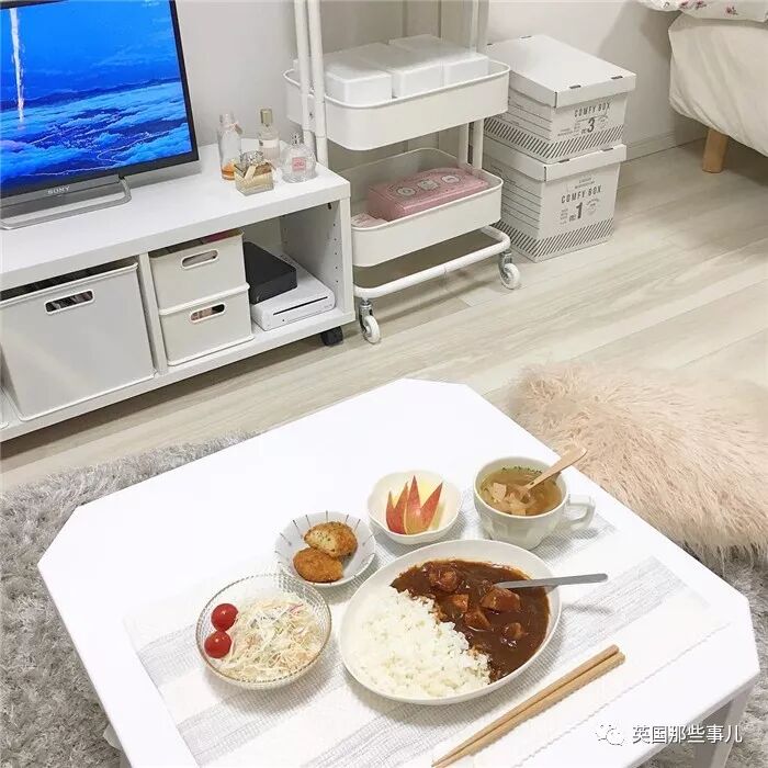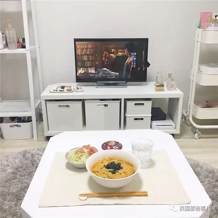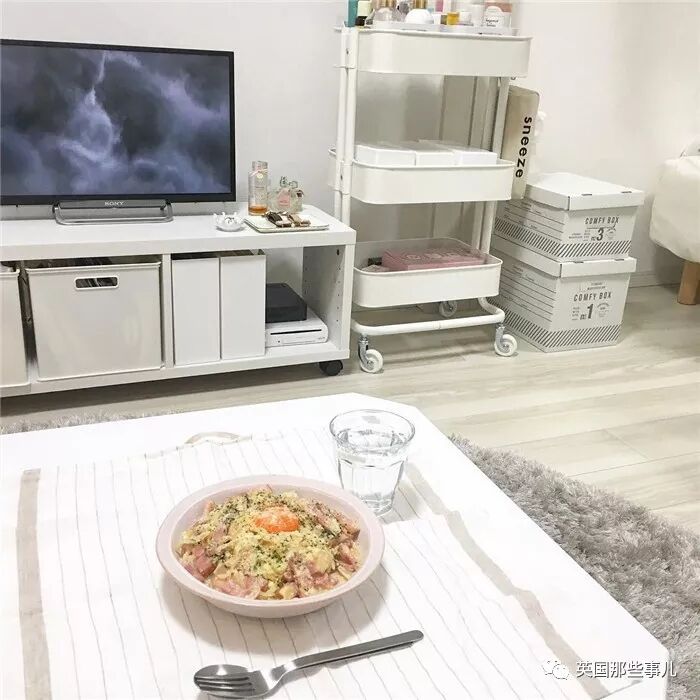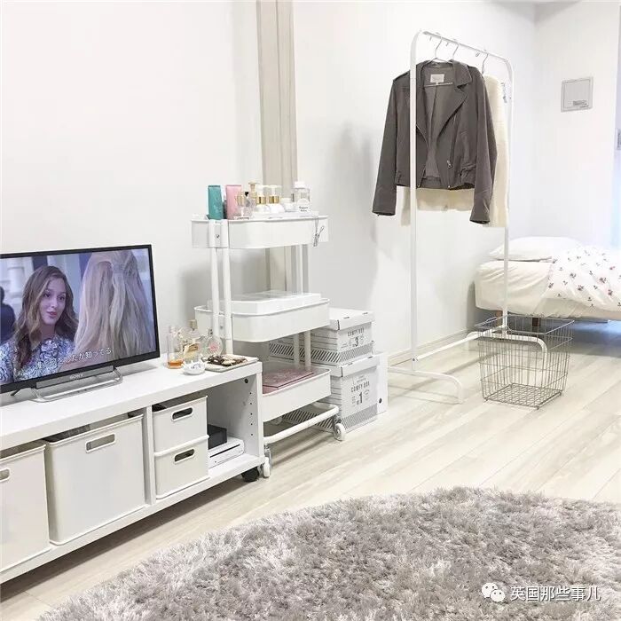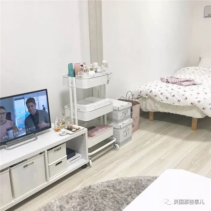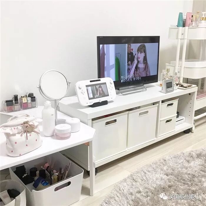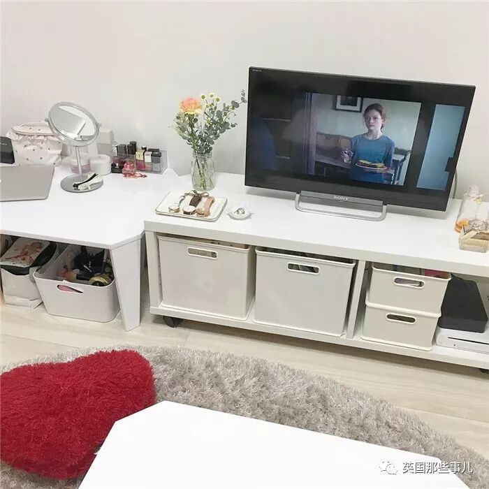白色的电视柜下面,放着几个大小正合适的白色收纳箱,