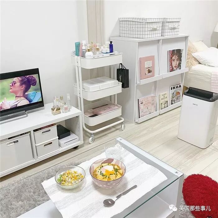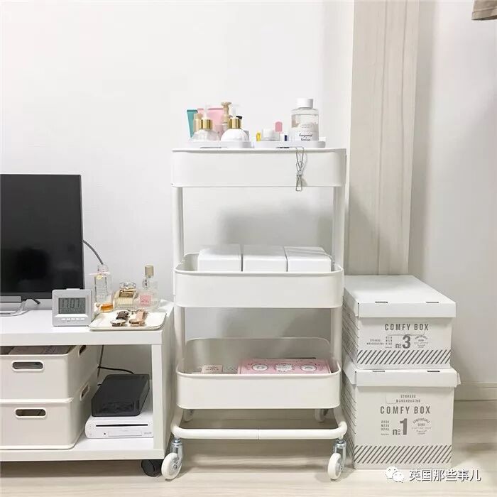 电视柜的一边,放置了一个可移动式的白色三层收纳架,