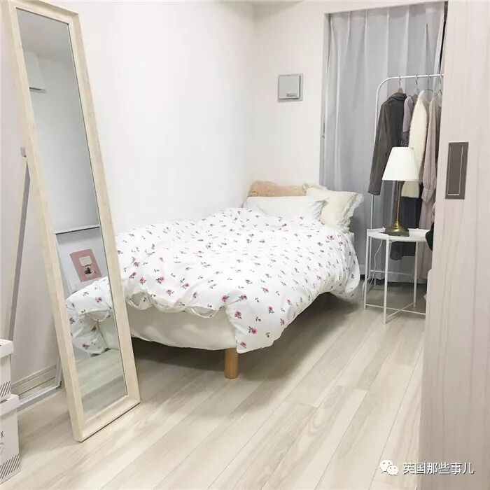 在床边还摆放了落地式挂衣架和一面全身镜,