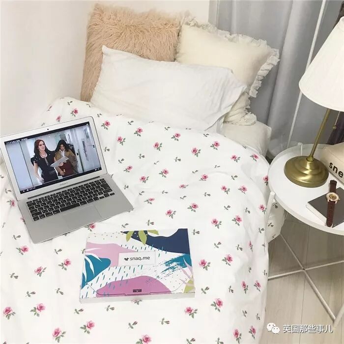白色带有花花图案的床品,
