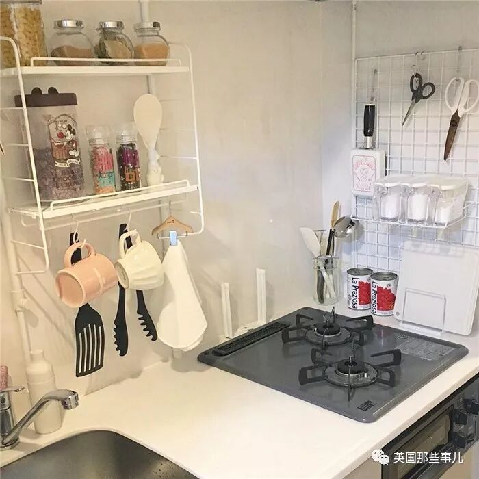每天要用的调味料,则用架子收纳在炉灶旁的墙上,节省空间而且取放顺手方便。