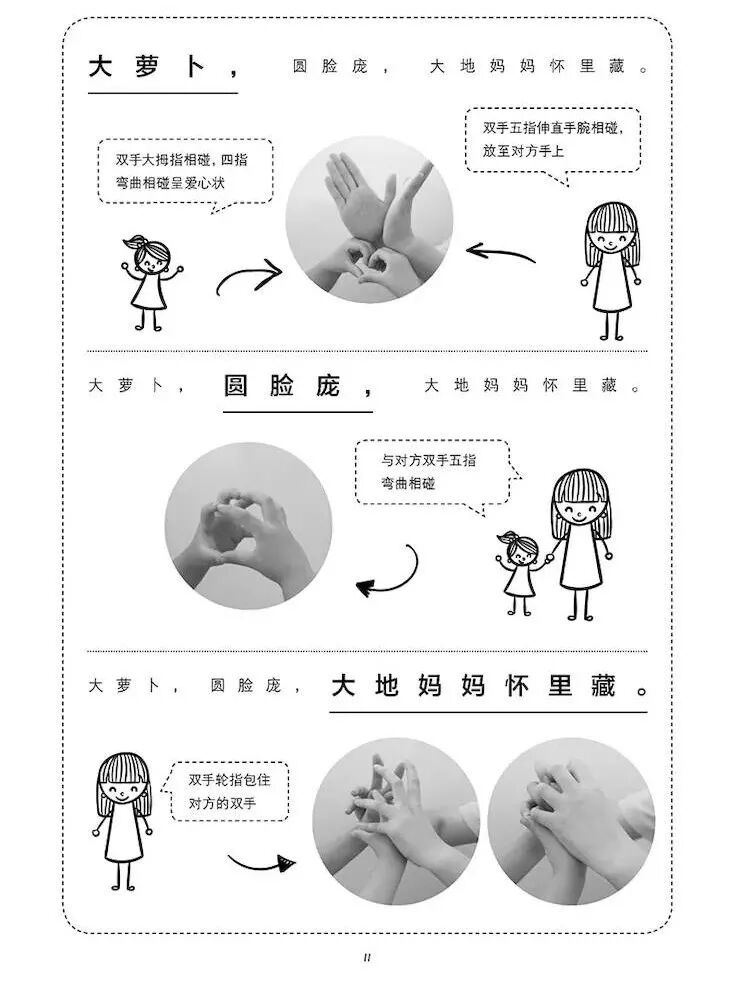 这本双人手指游戏【口袋本】——《指尖上的韵动》,包含了《我有一双小小手》、《眨眼睛》、《大萝卜》等40首孩子们耳熟能详的儿歌改编的手指游戏。
