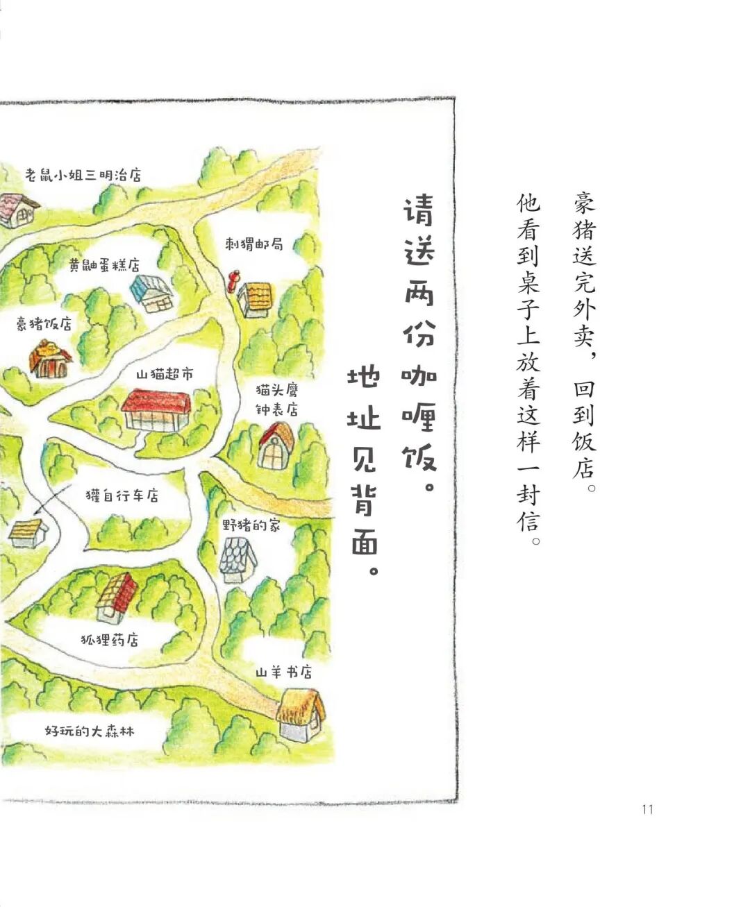 在故事中,豪猪收到了一份外卖订单,但是收货地址居然需要自己来解谜。根据谜题上的线索,豪猪找到了老鼠小姐三明治店,正当他高兴时,没想到又看到了另一个线索谜题。于是,他先后来到了刺猬邮局、獾自行车店、青蛙气象局、鲇鱼的家,可他们都不是订咖喱饭的人。直到最后豪猪来到臭鼬的家,这才找到了订咖喱饭的人——臭鼬。