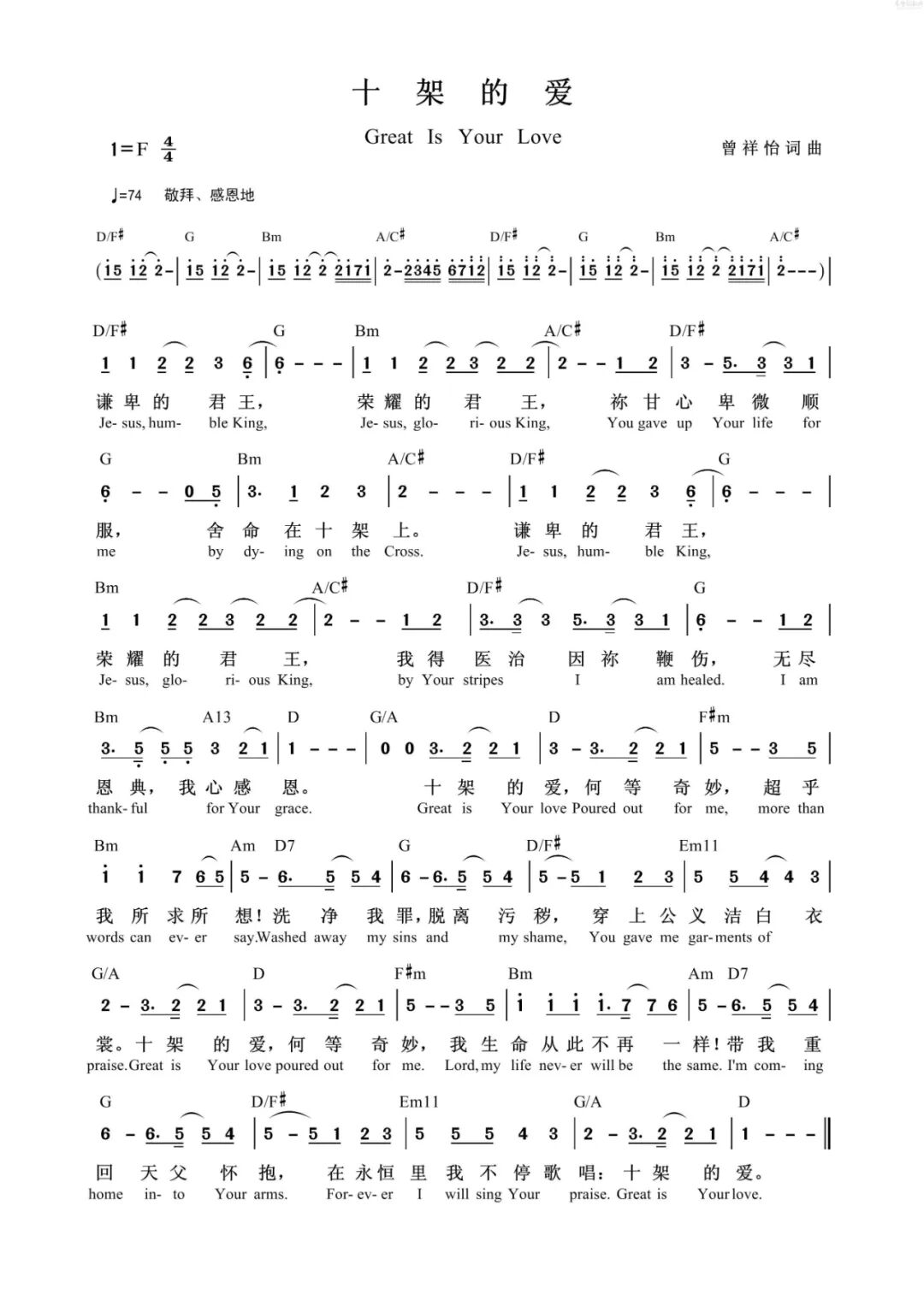 Amazing Grace Words: John Newton Arranged by Edwin O. Excell [Verse] Amazing grace! How sweet the sound That saved a wretch like me! I once was lost, but now am found; Was blind, but now I see. [Verse] 奇异恩典 何等甘甜 我罪已得赦免前我失丧 今被寻回 瞎眼今得看见 - - - - - - - - - - - - - - 十架的爱 Great is Your Love 词曲:曾祥怡 Grace Tseng © 2012 Stream of Praise Music / BMI. CCLI #6400503 赞美之泉版权所有 [Verse] 谦卑的君王 荣耀的君王 祢甘心卑微顺服 舍命在十架上 谦卑的君王 荣耀的君王 我得医治 因祢鞭伤 无尽恩典 我心感恩 [Chorus] 十架的爱 何等奇妙 超乎我所求所想 洗净我罪 脱离污秽 穿上公义洁白衣裳 十架的爱 何等奇妙 我生命从此不再一样 带我重回天父怀抱 在永恒里我不停歌唱 十架的爱