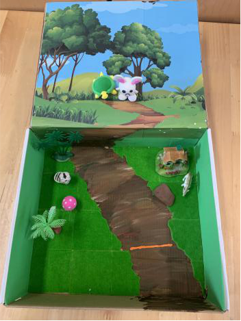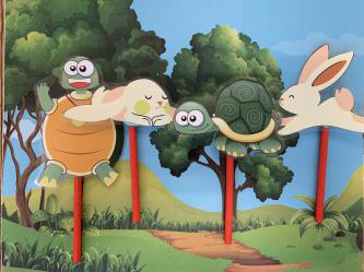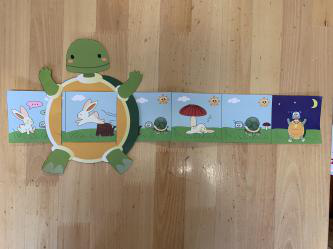 在故事情境中通过乌龟与兔子的角色扮演,用完整的角色语言讲述故事。