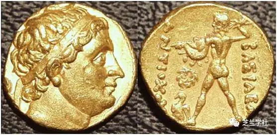 (正面是戴扁平毡帽的王像,背面是“一手持奈克雕像、一手持盾的雅典娜坐像”,钱铭:BAΣIΛEΩΣAΠOΛΛOΔOTOY“王阿波罗多图斯”)