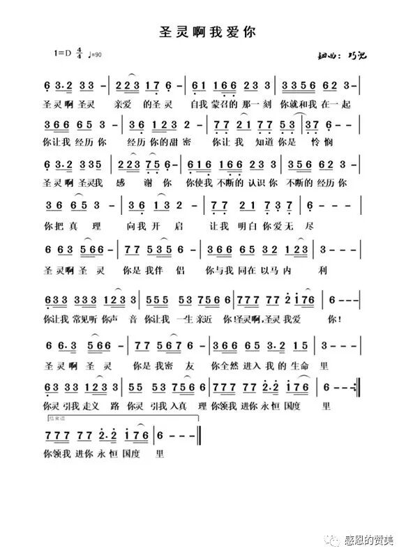 圣灵啊我爱你 词曲:巧儿 演唱:王梓旭 编曲:心的回归 圣灵啊圣灵亲爱的圣灵, 自我蒙召的那一刻, 你就和我在一起。 你让我经历你, 经历你的甜蜜。 你让我知道你是怜悯 圣灵啊,圣灵,我感谢你, 你使我不断的认识你,不断的经历你, 你把真理向我开启。 让我明白你爱无尽 圣灵啊圣灵,你是我伴侣, 你与我同在,以马内利。 你让我常听见你声音 你让我一生亲近你。 圣灵啊圣灵我爱你, 圣灵啊圣灵,你是我密友, 你全然进入我的生命里, 你灵引我走义路, 你灵引我入真理, 你领我进入你永恒国度里, 间奏 圣灵啊圣灵亲爱的圣灵, 自我蒙召的那一刻, 你就和我在一起。 你让我经历你, 经历你的甜蜜。 你让我知道你是怜悯 圣灵啊,圣灵,我感谢你, 你使我不断的认识你, 不断的经历你, 你把真理向我开启。 让我明白你爱无尽 圣灵啊圣灵,你是我伴侣, 你与我同在,以马内利。 你让我常听见你声音 你让我一生亲近你。 圣灵啊圣灵我爱你, 圣灵啊圣灵,你是我密友, 你全然进入我的生命里, 你灵引我走义路, 你灵引我入真理, 你领我进入你永恒国度里, 你领我进入你永恒国度里。