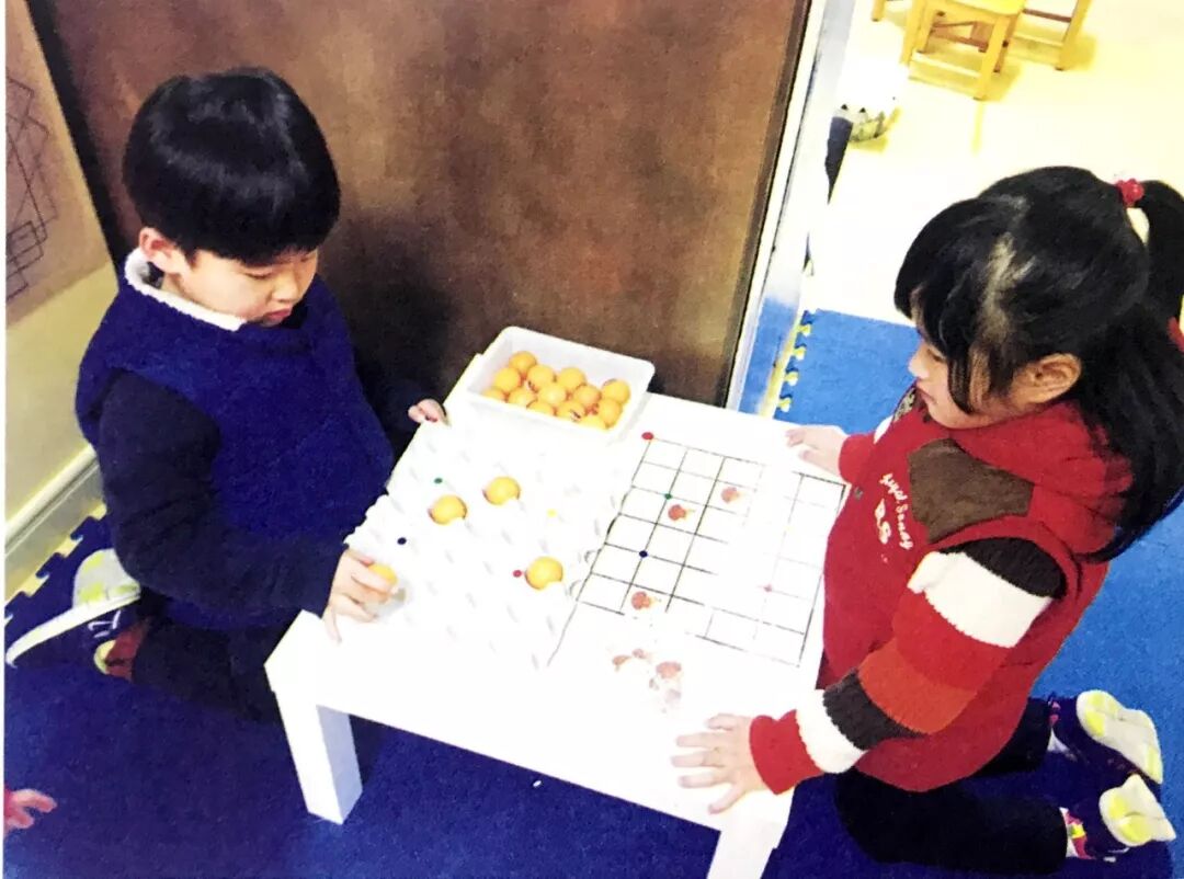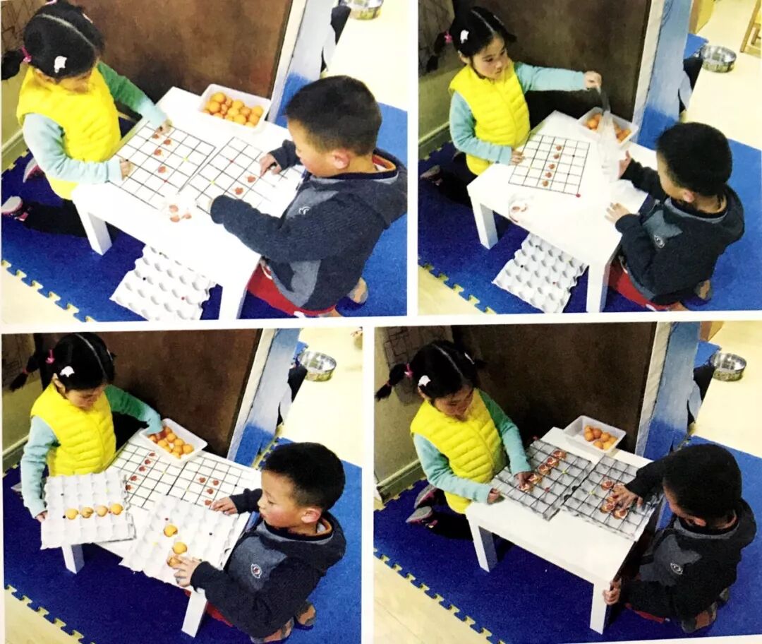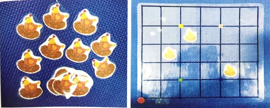 两名幼儿结伴游戏。两人各拿取相同数量的母鸡图片,分别在两张空白题卡的任意位置贴上母鸡图片。然后交换题卡,双方根据对方给出的题卡,完成下蛋任务。比比谁下蛋的速度快,位置正确且最快的一方获胜。