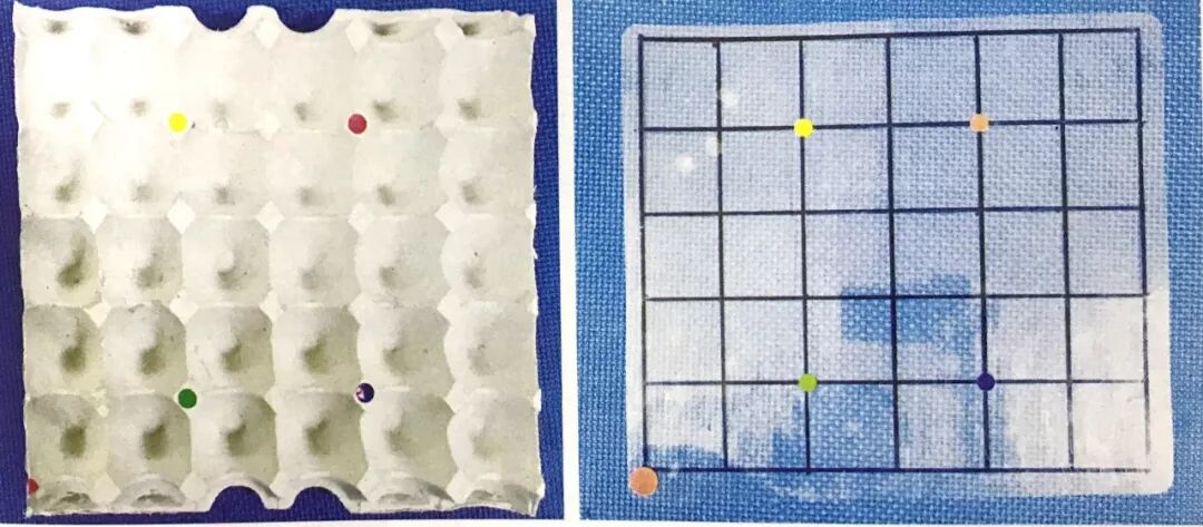 1.收集两个废旧蛋盒,处理干净之后,在蛋盒的四个方位分别用四种颜色做标记,帮助幼儿在游戏中识别方位。
