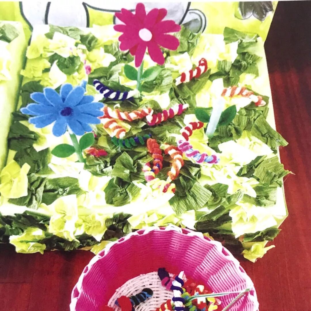 幼儿们可以选择使用镊子或宽头的夹子在草丛里夹可爱的“毛毛虫”,把“毛毛虫”夹到红色的篮筐里面。