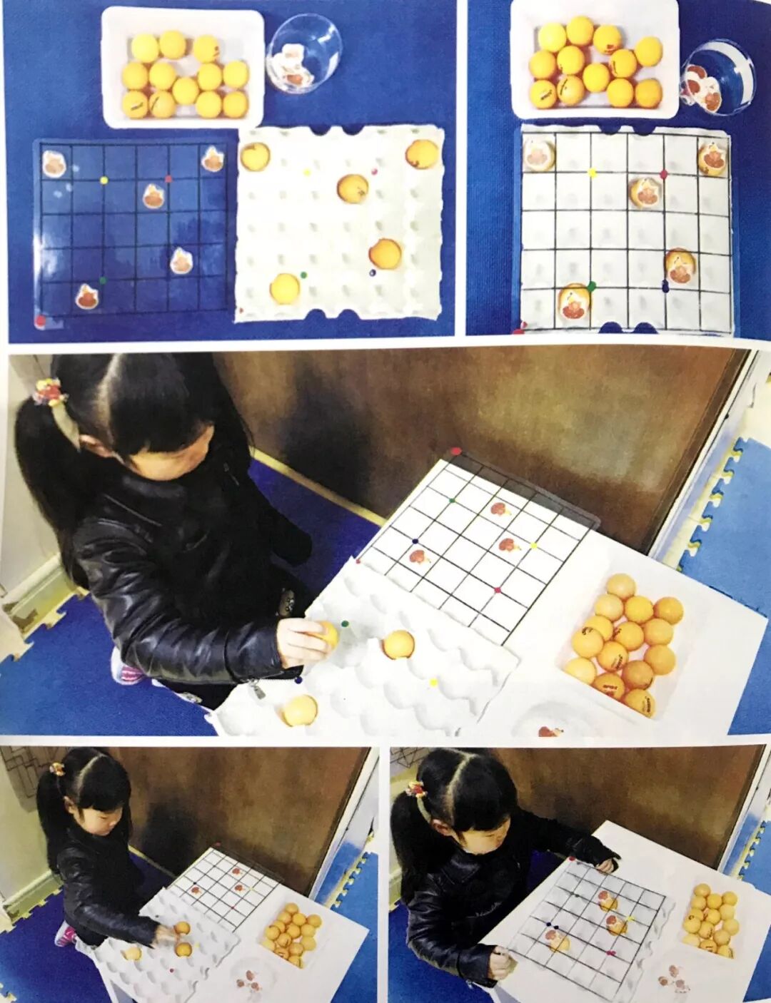 一名幼儿进行游戏。任意抽取一张塑封题卡,根据题卡上母鸡所在的位置,在蛋盒相应的位置放上鸡蛋。游戏完成后,将透明题卡盖在蛋盒上,验证母鸡下蛋的位置是否正确。