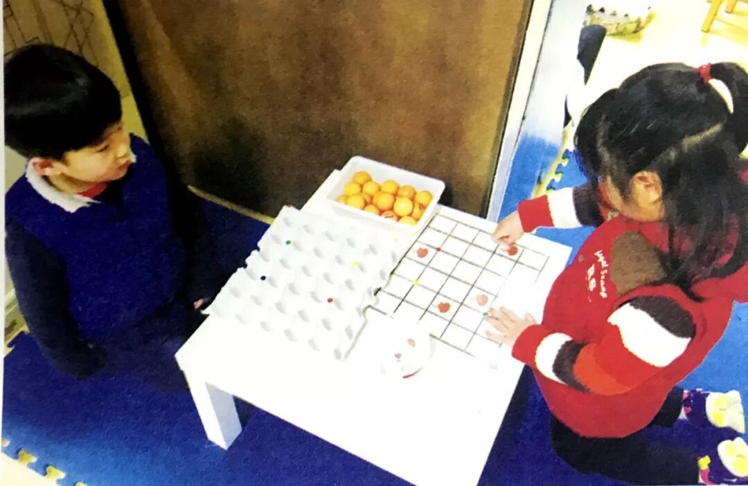 两名幼儿结伴游戏。一人先在空白题卡上任意贴上几张母鸡图片,然后用语言描述母鸡所在的位置。另一位幼儿根据语言描述将蛋放在蛋盒的相应位置。最后盖上题卡,验证是否正确。