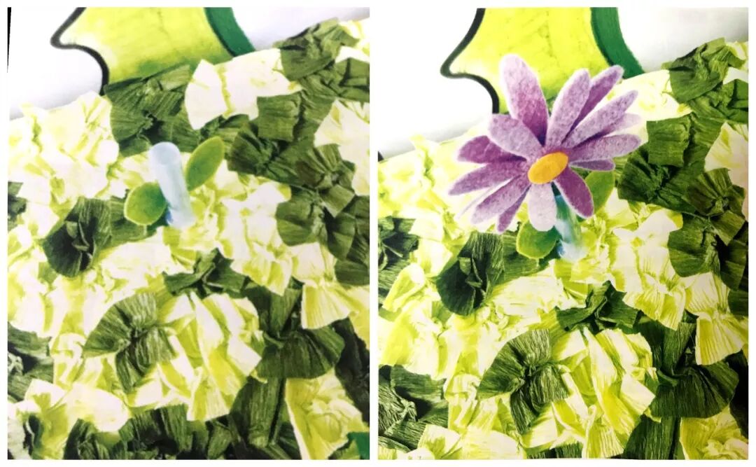 选择五个大小尺寸一样的纸板箱,用裁好的绿色和深绿色的皱纸,逐一粘贴箱子表面,全部平铺后,形成一块“草地”。