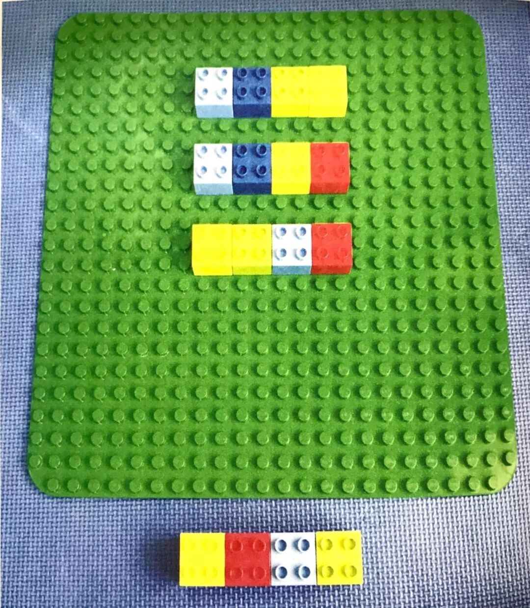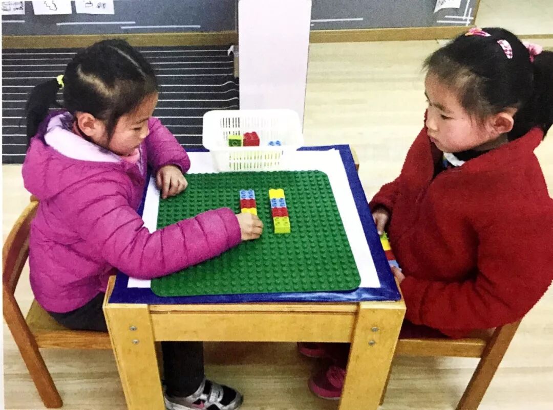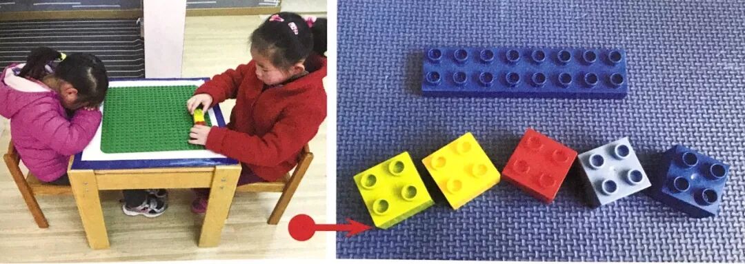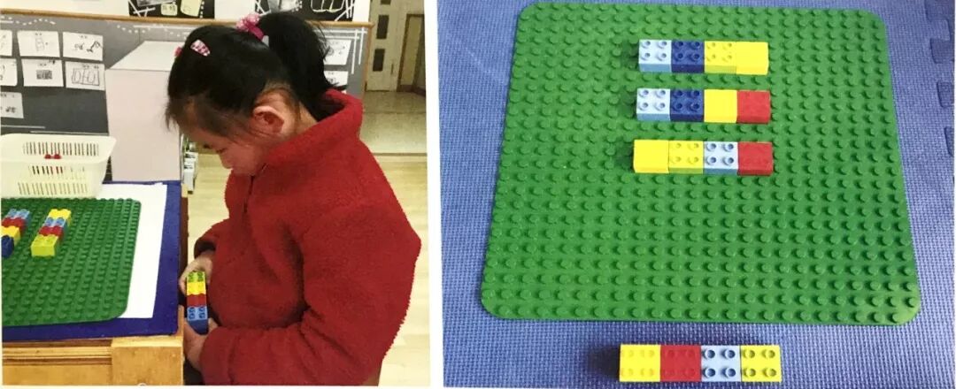 将底版放在桌面上,为幼儿提供5种颜色的乐高积木。如果活动室中缺少乐高积木,也可以用普通彩色积木代替。