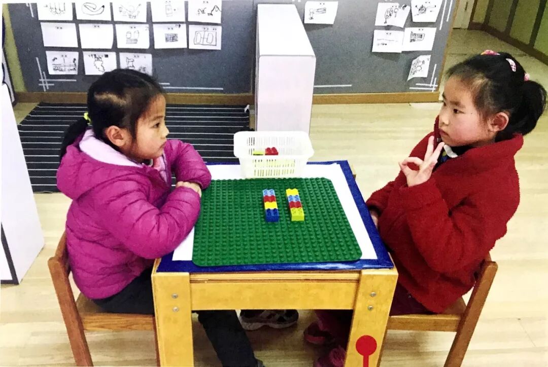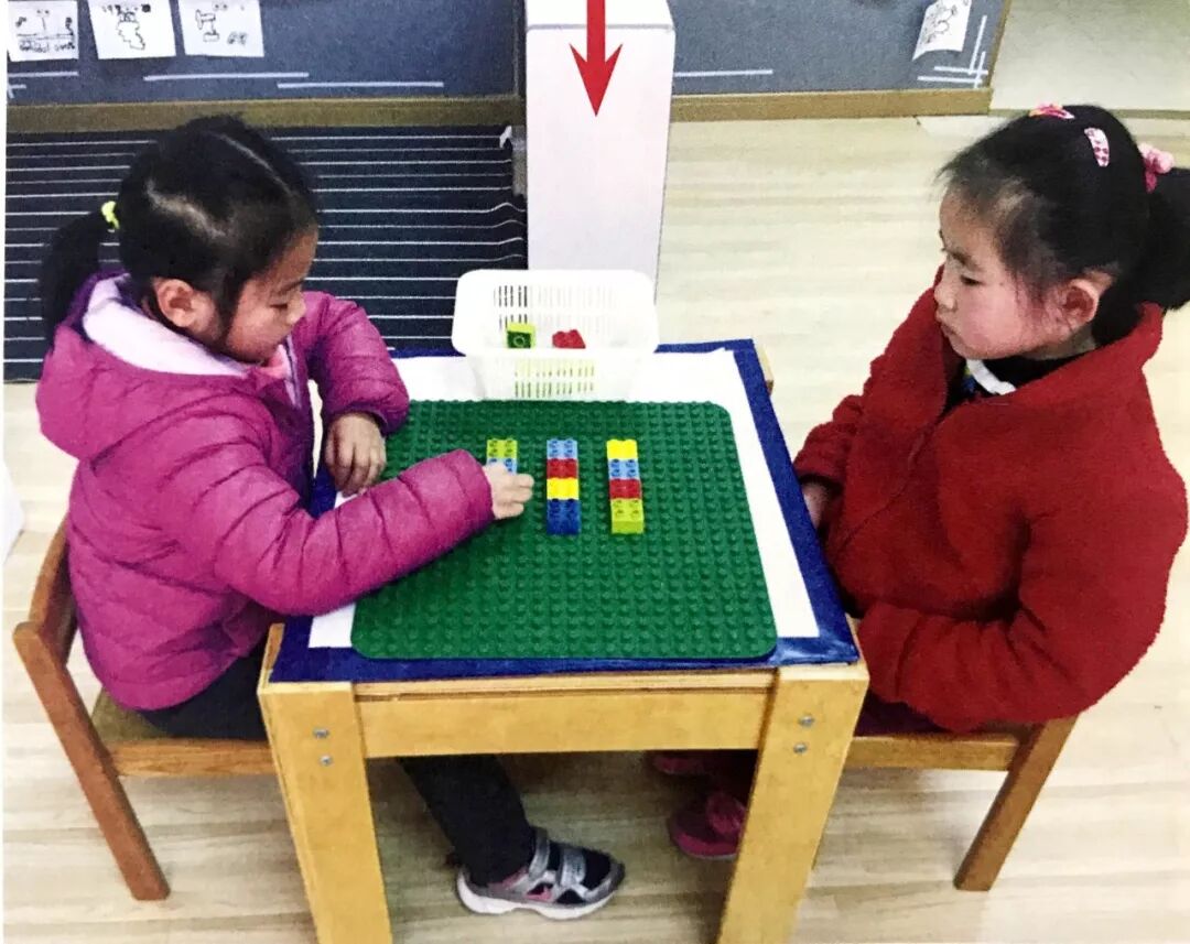 设置密码过程同玩法1。破译密码的幼儿不仅要猜对颜色,还要猜对4个色块的依次摆放顺序。设置密码的幼儿也需要给予相应的提示,如:颜色对了3种,颜色和位置都摆对的有1个积木。