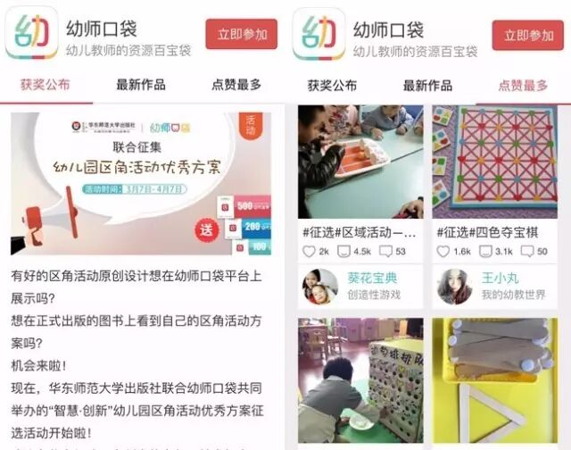 够全、够精,涵盖各大区角和年龄段。我们还与华东师范大学出版社在幼师口袋APP上联合发起了[幼儿园区角活动优秀方案]征集活动,