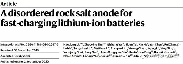 近期,美国加州大学圣地亚哥分校Ping Liu教授与Shyue Ping Ong教授,加州大学欧文分校Huolin Xin教授和阿贡国家实验室Jun Lu研究员为共同通讯作者,提出了一种新型无序岩盐氧化物Li3+xV2O5负极材料,在0.6 V电压下电极能够可逆地循环两个锂离子。与石墨相比,具有更大的潜力,降低了锂金属电镀的可能性,从而减轻了与锂枝晶生长有关的短路安全隐患。此外,相比于商用的钛酸锂,无序岩盐Li3+xV2O5负极具有更低的电压,更高的比容量,更高的能量密度。相关论文以题为“A disordered rock salt anode for fast-charging lithium-ion batteries”发表在Nature上。