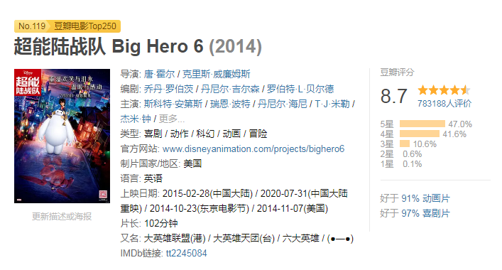 很多孩子们科幻电影总是十分感兴趣。这只萌大白一经曝光,便成了全球最热的电影周边,谁不幻想自己身边有一个时刻保护着自己,无敌又可爱的大白呢?本片获得第87届奥斯卡最佳动画长片奖,在全球都掀起了热潮。