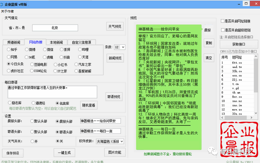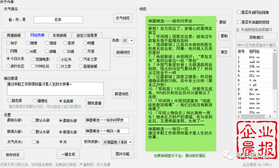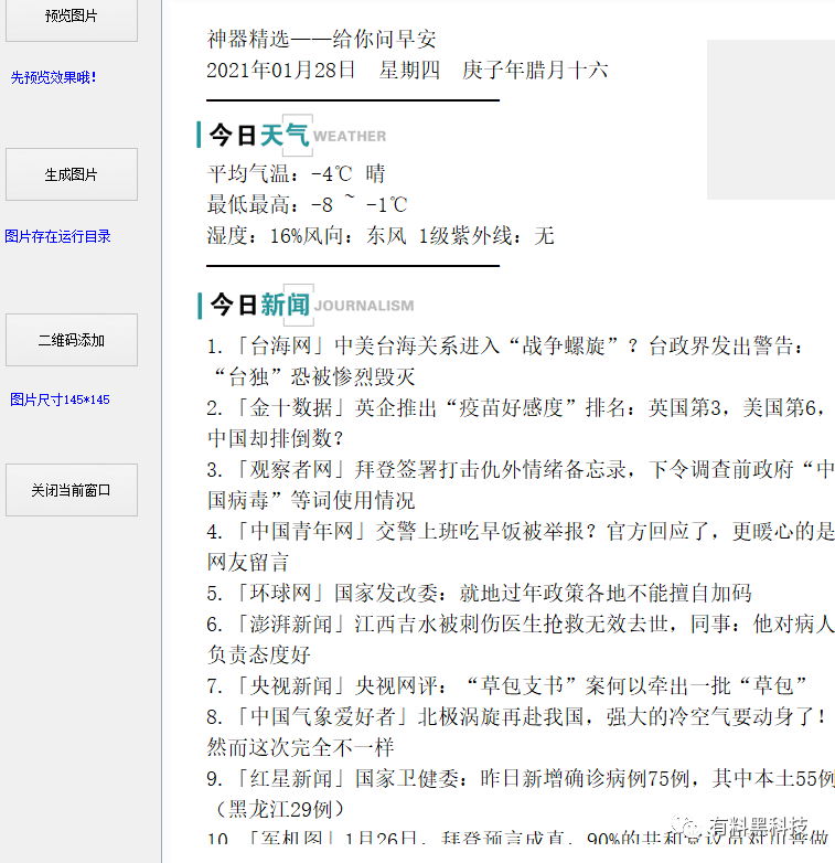 本期神器妹分享一款微信晨报生成器128终极版,2021年1月31日更新,支持一键智能生成每日热点新闻、每日天气情况,每日寄语等等,非常适合微信群早报分享,活跃一下人气。