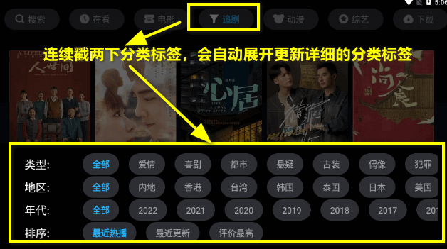 3、 「小書视界TV2.1新版」 的详细分类标签页是隐藏的,连续戳两下分类标签,就会自动展开相关更详细的分类标签。