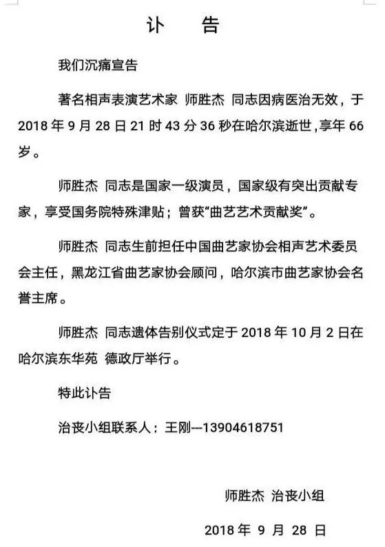 9月28日晚,黑龙江省曲艺团发布讣告:著名相声表演艺术家师胜杰因病医治无效,于当天21时43分在哈尔滨去世,享年66岁。