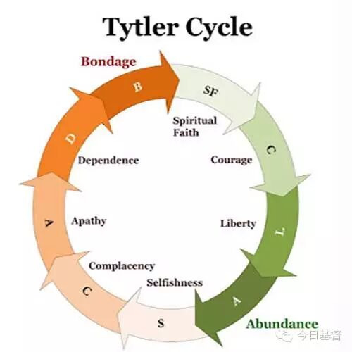 苏格兰历史学家亚历山大•弗雷泽•泰勒(Alexander Fraser Tytler)提出了著名的“泰勒循环”。他说:“民主并不是一种可以长久维持的管治制度。当选民发现他们可以利用投票权,选出一些承诺大洒金钱的候选人,大多数群众都不会抗拒甜言蜜语的诱惑,直到国库空虚、民穷财尽的时候,民主制度就会土崩瓦解,被独裁取而代之。历史上伟大的文明平均只有二百多年寿命。这些民族兴衰交替的过程如下:(1)由奴役到属灵信仰,(2)由属灵信仰到勇敢,(3)由勇敢到自由,(4)由自由到丰裕,(5)由丰裕到自私,(6)由自私到自满,(7)由自满到冷漠,(8)由冷漠到依赖,(9)由依赖再次回到奴役。”