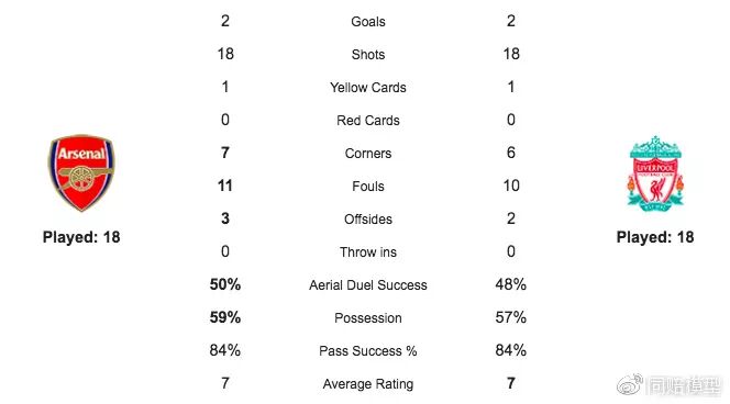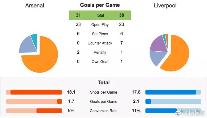 先来看双方18轮过后的场均数据对比:双方场均射门18:18,场均控球率59%:57%,场均传球成功率84%:84%。同时进攻效率方面,阿森纳31个进球23个来自运动战,6个定位球得分,2个点球得分;利物浦38个进球中23个来自运动战,6个定位球得分,7个反击得分、1个点球得分和1个对方乌龙送分。利物浦多出的7个进球全部依靠反击得手,相当犀利。