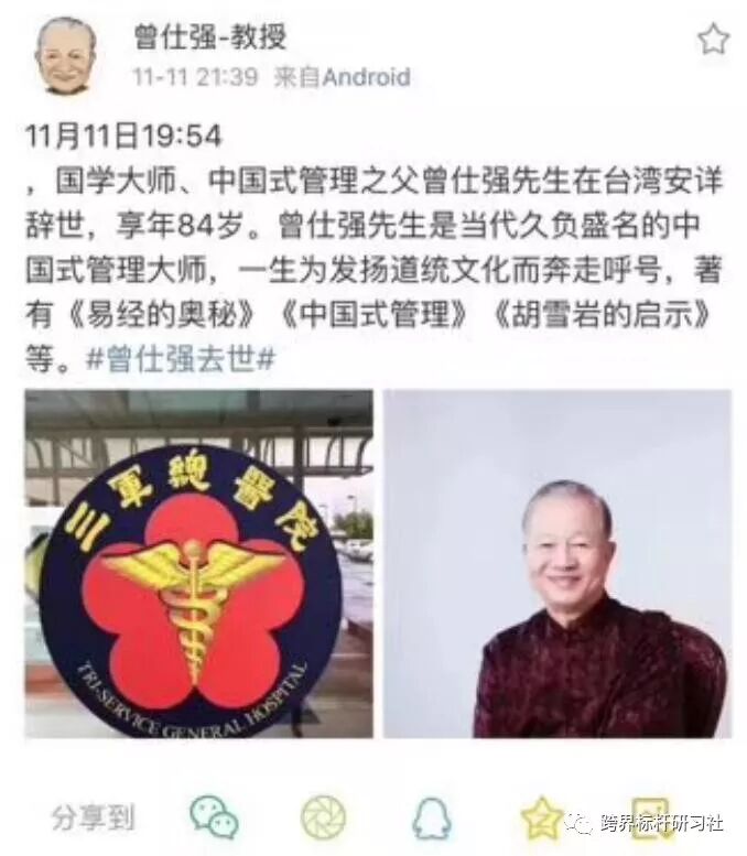 11月11日19:54分,台湾著名学者曾仕强在台湾去世,享年84岁!又一巨星陨落。