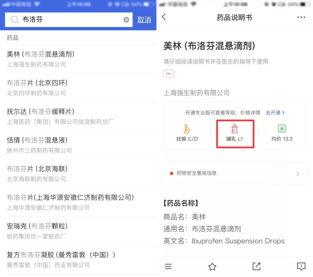 可以很方便知道药物的具体分级。比如我们查询了“布洛芬”,选择了下面的“美林(布诺芬混悬滴剂)”,可以看到它是L1级的药物,哺乳妈妈服用较安全。
