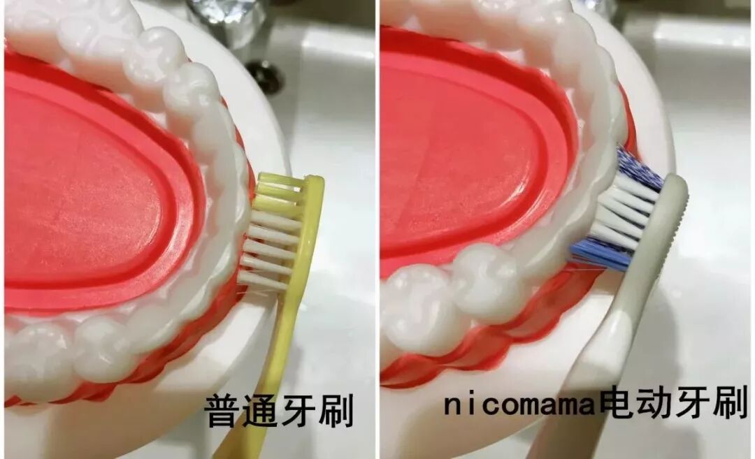对比下普通牙刷,nicomama这款牙刷有独特的弧度,非常贴合牙齿,连牙缝也绝不放过。