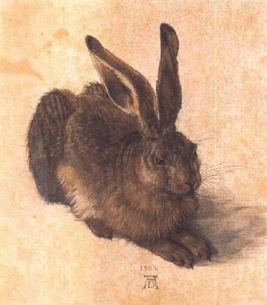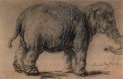 但是在这一点上刚刚接触艺术的人往往要遇到另一种困难。初学者乐于赞扬艺术家表现自己所见事物的技艺。他们最喜欢的是看起来“逼真”的绘画。我绝不否认这是一个重要的考虑因素。忠实摹写视觉世界的耐心和技艺确实值得赞扬。以往的伟大艺术家已经奉献出巨大的劳动,创作了精心记录每一个细节的作品。丢勒的水彩画稿《野兔》(图9)就是体现这种耐心的最著名的实例之一。但是谁能说由于细部描绘较少,伦勃朗的素描《大象》(图10)就必然相形见绌呢?伦勃朗不愧为奇才,寥寥的几道粉笔线条就便我们感到大象的皮肤皱襞重重。