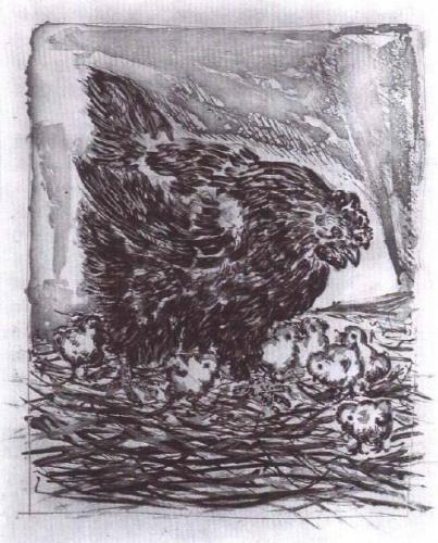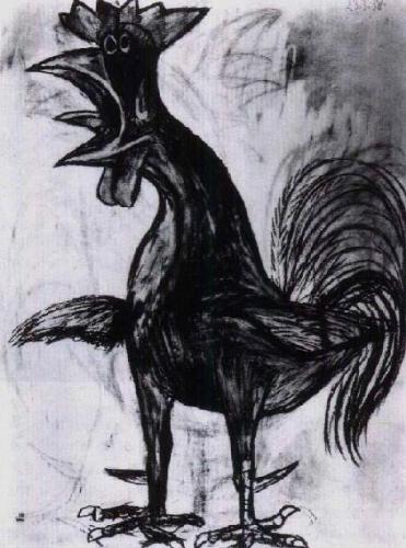 但是,对于那些喜欢绘画看起来“真实”的人,主要还不是粗略的画风触犯了他们。他们更为反感的是他们认为画得不正确的作品,特别是年代距今较近的作品,因为这个时期的艺术家“本来应该更加高明一些了”。在讨论现代艺术时,我们依然能够听到人们抱怨它们歪曲自然,其实被指责的地方并非不可思议。看过迪斯尼(Disney)动画片的人,或者看过连环漫画的人,对其中的奥秘无不了如指掌。他们知道,在这里或那里改动一下,歪曲一下,并不按照眼睛看见的样子去描绘事物有时倒是正确的。米老鼠看起来并不跟真老鼠惟妙惟肖,可是没有人给报纸写信对鼠尾的长短愤慨不平。进入迪斯尼魔幻世界的人并不为大写的艺术担忧。他们看动画片跟看现代绘画展览不同,未尝带有看画展时习以为常的偏见。然而,如果一个现代艺术家别出心裁地作画,就很容易被看成是画不出好东西来的蹩脚货。可是,不管我们对现代艺术家的看法如何,我们都可以毫无保留地相信他们有足够的知识,完全能够画得“正确”。如果他们不那样画,其原因可能跟瓦尔特·迪斯尼一样。图11是著名的现代派艺术运动先驱者毕加索为插图本《自然史》(Natural History)画的一幅插图。他画的母鸡和毛绒绒的小鸡十分逗人,的确无可挑剔。但是在画一只小公鸡时(图12),毕加索就不满足于仅仅描摹出一只鸡的外形。他想画出它的争强好斗、它的粗野无礼和它的愚蠢无知。换句话说,他使用了漫画手法。然而这是一幅多么令人信服的漫画啊!