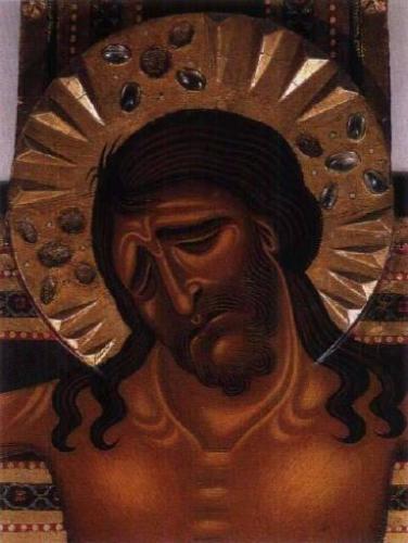 美是这种情况,艺术表现也是这种情况。事实上,左右我们对一幅画的爱憎之情的往往是画面上某个人物的表现方法。有些人喜欢自己容易理解因而也能深深为其所动的表现形式。17世纪意大利画家圭多·雷尼在画十字架上的基督的头部时(图7),无疑希望人们在这张脸上看出基督遇难时的全部痛苦和全部光荣。在其后的世纪里,很多人从这样一幅救世主画像中汲取了力量和安慰。这幅作品表现的感情是如此强烈,如此明显,以至于在路边的简陋神龛里和边远的农舍中都可以见到它的摹本,而那里的人们对艺术一无所知。尽管我们很喜欢内在感情如此强烈的表现,却不应该因此就对表现方法也许较难理解的作品不屑一顾。那位画耶稣受难图(图8)的中世纪意大利画家对耶稣受难一事感受之深切一定不亚于雷尼,然而我们必须首先学会理解他的绘画手法,然后才能了解他的感情。在逐渐理解了那些互不相同的绘画语言以后,我们甚至有可能对表现方法不像雷尼的画那么明显的艺术作品更觉喜爱。正如一些人比较喜欢言词简短、手势不多、留有余意让人猜测的人一样,有些人喜爱留有余韵让他们去猜测和推想的绘画或雕塑。在比较“原始”的时期,艺术家不像现在这样精于表现人们的面目和姿态,然而看到他们依然是那样努力表现自己想传达的感情,往往更加动人心弦。