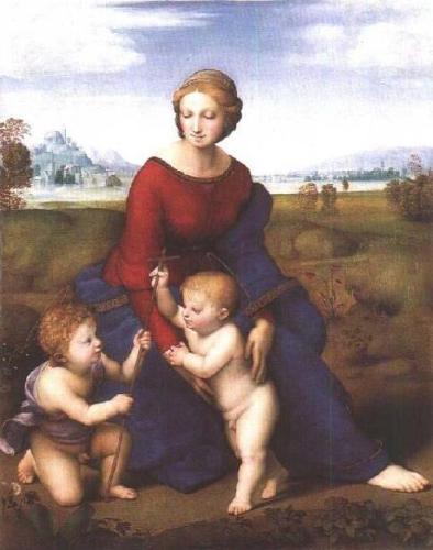以拉斐尔的圣母像名作之一《草地上的圣母》(The Virgin in the Meadow)(图17)为例。毫无疑问,它是美丽动人的;画面中的人物画得令人赞叹不已,圣母俯视着两个孩子,她的表情使人难以忘怀。但是,如果看一看拉斐尔为这幅画所作的那些速写稿(图18),我们就开始省悟原来这还不是他最费心力的地方,在他心目中,这些地方当然要这样画。他之所以反复尝试着追求的是人物之间的合适的平衡和使整个画面达到极端和谐境地的合适的关系。在左角的速写稿中,他想让圣婴一面回头仰望着他的母亲,一面走开。他试画了母亲头部的几个不同姿势,以便跟圣婴的活动相呼应。然后,他决定让圣婴转个方向,仰望着母亲。他又试验另一种方式,这一次加上了小圣约翰,但是让圣婴的脸转向画外,而不去看他。后来他又作了另一次尝试,并且显然急躁起来,用好几个不同的姿势试画圣婴的头部,在他的速写簿中这样的画页有好几张,他反复探索怎样平衡这三个人物最好。但是,如果我们现在回过头来再看最后的定稿,就会发现他最终确实把这幅画画得合适了。在画面上物物各得其所,而拉斐尔通过努力探索最终获得的姿态与和谐显得那么自然,那么不费力气,几乎未曾引起我们的重视。而恰恰是这种和谐使圣母更加美丽,使孩子们更加可爱。