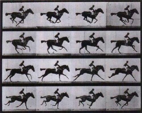所以,如果我们看到一幅画画得不够正确,那么不要忘记有两个问题应该反躬自问。一个问题是,艺术家是否无端地更改了他所看见的事物的外形。在本书下文讲述艺术的故事时,我们就会对艺术家进行更改的道理有较多的了解。另一个问题是,除非已经证明我们的看法正确而画家不对,否则就不能指责一幅画画得不正确。我们都容易急不可待地作出结论,说“事物看起来并非如此”。我们有个很奇怪的习惯念头,总是认为自然应该永远跟我们司空见惯的图画一样。不久前的一项惊人发现就是个很好的例证。世世代代的人都看见过奔马,参加过赛马和打猎,欣赏过表现纵马冲锋陷阵或者追随猎狗驱驰的绘画作品和体育图片。可是人们似乎都没有注意到一匹马在奔跑之中“实际显现出”什么样子。绘画作品和体育图片通常把它们画成四蹄齐伸,腾空飞奔——像19世纪伟大的法国画家热里科(Gericault)的名画《埃普瑟姆赛马》(图13)中画的那样。此画出世以后,大约过了50年,照相机已经相当完善,足以快拍飞驰的奔马,所拍的照片证明,画家和他们的观众以往都弄错了。没有一匹马奔跑的方式符合我们认为非常“自然”的样子。一匹马的四蹄离地时,马腿是交替移动,为下一次起步做准备(图14)。我们稍加考虑就会明白,若非如此,马就难以前进。可是,当画家开始运用这个新发现按照实际模样去画奔马时,人人都指责他们的画看起来不对头。