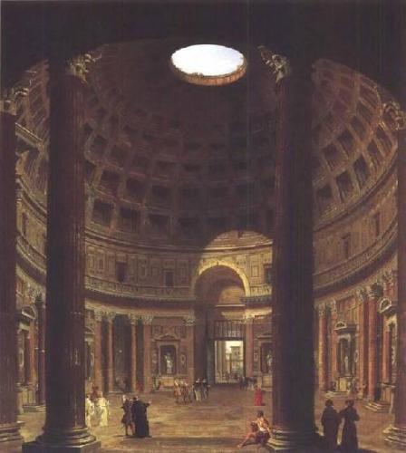 然而罗马建筑的最重要的特点是拱的使用。虽然这项革新希腊建筑师可能早已发现了,但是它在希腊建筑中却几乎没有发挥什么作用。用一块块楔形石头拼成拱形是一种颇为困难的工程技术。一旦掌握了这项技艺,建筑者就能用它组成越来越大胆的设计。他可以用拱横跨桥梁或输水道的墩柱,他甚至也可以用这个方法拼成拱状屋顶。通过各种技术设计,罗马人逐渐对起拱技艺十分精通。那些建筑物中最奇妙的一座就是Pantheon,即万神庙。它是惟一的一座过去一直用做礼拜堂的古罗马神庙——早期基督教时代它被改成教堂,所以一直不准沦为废墟。万神庙内部(图75)是一个巨大的圆厅,有拱状屋顶,顶部有一个圆形开口,从开口可以看到天空。此外没有别的窗户,但是整个大厅可以从上面接收充足而均匀的光线。在我知道的建筑物中,几乎没有一个能像它这样,给人这么沉静的和谐印象。里面完全没有沉闷的感觉。巨大的屋顶穹窿仿佛自由地在你头顶盘旋,好像第二个天穹。