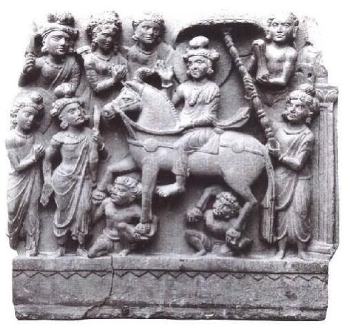 在希腊化影响到来之前,印度早已盛行雕刻艺术;然而却是在边境地区犍陀罗(Gandhara)首先出现了佛陀的浮雕像,以后佛教艺术就以它为样板。图80表现的就是佛传中的一个插曲,叫做《夜半逾城》: