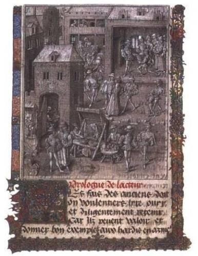 其他北方画家就更为接近贝诺佐·戈佐利,贝诺佐·戈佐利在佛罗伦萨的梅迪奇宫中画的那些壁画,是用国际式风格的传统精神反映出美好世界的华丽的盛会;特别是设计花毯的画家和装饰珍贵的写本书页的画家更是如此:图177所示的一页就大约画于15世纪中叶,跟戈佐利的壁画时间相仿。背景还是传统场面,画的是作者把成书交给让他作书的高贵的赞助人。但是画家认为单单那样一个主题相当枯燥,于是他就把门厅的环境加进去,把周围发生的各种事情部给我们——画出来。在城门后面有一帮人,显然准备去打猎——至少有一个花花公子式的人物手上架着猎鹰,而其他人好像傲慢的市民站在周围。我们看见城门里面和外面有货摊和商亭,商人们陈列出货物,顾客们正在观看。这是当时中世纪城市的真实写照。像这样的画绝不可能出现于100年以前,甚至其前任何时代都不可能出现。我们不得不回到古代的埃及艺术去寻找像它这样忠实地描绘人们日常生活的图画;而且,即使是埃及人也不这么准确、这么幽默地观察他们自己的社会。我们在《玛丽女王的诗篇》(见211页,图140)中曾一窥其例的那种逗趣的精神,在这些可爱的日常生活写照中开花结果了。北方的艺术不像意大利的艺术那样一心一意地想达到理想的和谐与美丽,而是喜爱这种日益盛行的再现生活的艺术类型。