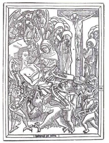 15世纪中叶,德国做出一项十分重大的技术发明,对艺术的进一步发展有巨大的作用,而且作用还不仅仅限于发展艺术——这就是印刷术的发明。印刷图画要比印刷书籍早好几十年,上面有圣徒像和祈祷词的小活页早已被印制出来以便发给朝圣的人和个人礼拜使用。印制那些图像的方法十分简单,跟后来印刷文字的方法相同。你拿一块木头,用小刀把不应该印出来的部分统统切掉。换句话说,凡是最后成品上应该出现空白的地方都要挖去;凡是应该出现黑色的地方都要留下,成为狭长的凸起棱线。最后看起来就跟我们今天使用的橡皮图章一样,把它印到纸上的原理实际上也没有差别:先在它的表面涂上油和煤烟制成的印刷油墨,然后把它压在纸上即可。一块版可以印很多次而不会用坏。印刷图画的这一简单技术叫做木刻(woodcut)。这种方法非常省钱,很快就普及开来。用一些印版印一套小型组画,并汇为一册,称为木刻版书(block-book)。木刻画和木刻版书很快就在民间集市上出售;纸牌也使用这种方法印制;还有幽默画和祈祷使用的印刷品。图184就是一本早期木刻版书中的一页,基督教用那本书来做图画布道。它的用意是提醒信徒想到临终的时刻,而且教给他们——正如标题所说的——“善终术”(The art of dying well)。这幅木刻画展示的是一个虔诚信教的人临终躺在床上,在他身边的修道士把点燃的蜡烛放到他手里。一个天使在接引他的灵魂,灵魂从他口中出来,是个小祈祷者的形象。在背景中,我们看到基督和他的圣徒们,那临终者应该把心灵转向他们。在前景中,我们看到一帮魔鬼,形状极为丑恶怪诞,从他们口中出来的词句告诉我们他们在说什么话:“我愤怒了”,“我们丢脸了”,“我目瞪口呆”,“这太不痛快了”,“我们已经得不到这个灵魂了”。他们千变万化的古怪举动徒劳无益。这个掌握了善终术的人已不必畏惧地狱的魔力了。