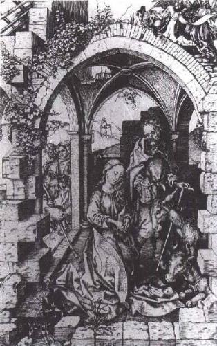 15世纪最伟大、最著名的雕版画大师之一就是马丁·舍恩高尔(Martin Schongauer, 1453?-1491),他住在莱茵河上游河畔的科尔马(Colmar),属于现在的阿尔萨斯地区(Alsace)。图185是舍恩高尔的雕版画《圣诞之夜》(Holy Night),这个场面是按照尼德兰大师们的精神加以表现的。跟那些大师们一样,舍恩高尔渴望传达出场面的每一个微末细节,力图使我们感觉到他所表现的物体的真正质地和外表。他不靠画笔和颜料,也不用油画手段,竟然成功地达到了目的,真是奇迹。人们可以用放大镜观察他的版画,研究他刻画碎石断砖、石缝中的花卉、攀缘在拱门上的常春藤、动物的毛皮和牧人的短须下巴所使用的手法。然而我们必须予以赞扬的还不仅仅是他的耐心和技艺。即使我们不了解用推刀工作的难处,也会喜爱他的圣诞的故事。圣母跪在被用做牲口房的破礼拜堂里,正在礼拜圣婴,她把圣婴小心地放在她的斗篷角上;圣约瑟手卓提灯,焦急而慈祥地看着她。公牛和驴也跟着她礼拜。卑微的牧人们正要跨过门槛;在背景中有一个牧人从天使那里接受了神示。在右上角,我们可以瞥见天堂的合唱队,他们在唱“人间和平颂”(Peace on Earth)。这些母题自身都是深深地扎根于基督教艺术的传统之中,但是把它们结合起来分布到画页上的手法却是舍恩高尔的独出心裁。印刷的画页和祭坛画二者的构图问题在某些方面是相似的;在这两种画中,体现空间和忠实地模仿现实的做法都绝不允许破坏构图的平衡。只有想到这个问题,我们才能充分欣赏舍恩高尔的成就。我们现在就明白为什么他选了一个废墟做环境——那里允许他使用破碎的砖石建筑残迹给场面加上坚固的框架,那些残迹形成一个开口,我们就从那里往里看。这个环境使他能够在主要人物身后加上一个黑色衬底,使得雕版画上不出现任何空白和没有趣味的地方。如果我们在画页上画两条对角线,就能够看山他是多么仔细地计划他的构图:两条对角线相交在圣母头部,那里就是版画的真正的中心。