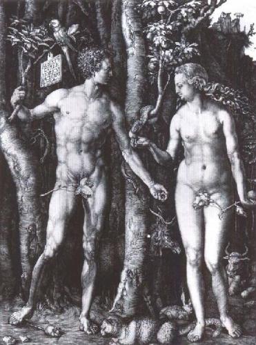 我们要想马上看出这一幅版画中的成就也许并不容易。因为艺术家在使用另一种语言,跟我们前而引以为例的那幅画中所使用的语言相比,他对目前这种语言还不那么熟悉。他辛勤地用圆规和直尺度量和平衡后所取得的和谐形状不像它们的意大利和古典模特儿那么真实而美丽。不仅在形状和姿势上,而且在构图的对称上,也有一些造作的形迹。但是丢勒不像二流艺术家那样,他没有失去自身的本色去崇拜新的偶像,一旦认识到这一点,认为这幅画笨拙的第一感很快就会消失。与他引导着我们进入画中的伊甸园(the Garden of Eden)的时候,那里的老鼠安静地躺在猫的身旁,麋、牛、野兔和鹦鹉也不畏惧人的足音;一旦我们的视线探入到生长着智慧之树的树丛之中,观看那条蛇在给夏娃命运之果,而亚当伸手去接,一旦我们注意到丢勒怎样努力使精心塑造的白皙身体的清晰轮廓,在长有粗糙树木的暗影之中显现出来,我们就会开始赞赏这种把南方的理想移植到北方土壤上的第一次认真的尝试。