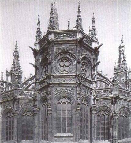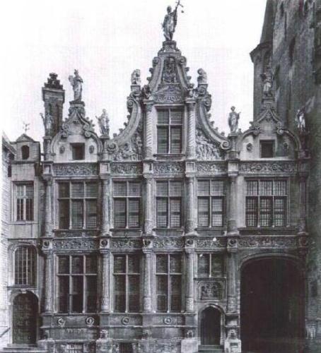 一个令人神往的奇观是去观察各种各样的艺术家和艺术传统在那种新学术的冲击下做出的反应,看一看他们是怎样地肯定自己,而有时他们又是怎样地低首屈服——反应的差异取决于他们性格的强弱和眼界的广狭。建筑家的处境大概最为困难。他们所习惯的哥特式传统和古代建筑的复兴。二者至少在理论上都完全符合逻辑,并不自相矛盾,但是在目标和精神方面彼此的差异之大却无以复加。所以经过很长的一段时间,阿尔卑斯山以北才在建筑中采用了新式样。他们采用新式样时,往往都是由于那些访问过意大利而且想赶上时代的君主和贵族们坚决要求而不得不从命。即使在这种情况下,建筑家也常常是按照新风格的要求在表面上敷衍一下。他们为了显示一下自己熟悉新观念,就在这里放上一根圆柱,那里放上一条饰带——换句话说,是给他们那丰富的装饰母题再添加一些古典的形式,多数情况是,建筑物的主体部分完全不变。法国、英国和德国有那么一些教堂,要么其中支撑拱顶的支柱已附加了柱头,因而表面上变成圆柱;要么其中的哥特式窗户满布花饰窗格,但是窗户的尖拱已经让步,改成圆拱(图218)。有一些老式的修道院却用古怪的瓶形圆柱支撑着;有一些满布塔楼和扶垛的城堡却用古典的细部做装饰;有一些带山墙的城镇住宅上还出现了一些饰带和胸像(图219)。一个认为古典规则尽善尽美的意大利艺术家,大概会对那些东西大为惊诧,掉头而去。但是,如果我们不用任何迂腐的学究标准去衡量它们,那么我们就常常会赞赏他们的聪敏和才智,竟把那些互不一致的风格调和在一起。