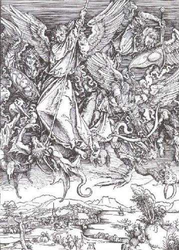 为了表现这一重大的时刻,丢勒彻底抛弃了传统上一直用以表现英雄人物跟仇人战斗的优雅、轻松的姿势。丢勒的圣米迦勒毫不装腔作势,他极为严肃认真。他用双手全力把他的长矛戳进龙的喉咙,这个有力的姿势控制了整个场面。在他四周有其他手执刀剑或弓箭的天使军,正在跟奇形怪状难以形容的残忍怪物们战斗。这个战场在天上,下面有一片风景未受惊扰,显得和平宁静,此外还有丢勒的著名的签字。