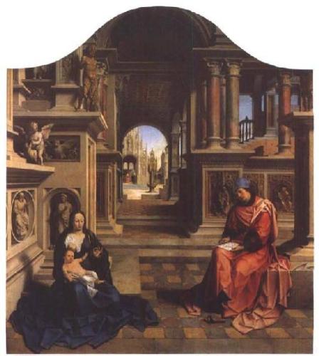 在16世纪开头几十年这个伟大的时期中,尼德兰出现的杰出的艺术家不像15世纪出现得那么多,在15世纪像杨·凡·艾克(见235-236页),罗吉尔·凡·德·韦登(见276页)和胡戈·凡·德·胡斯(见279页)那样的大师已名满全欧。而这一段时期的艺术家,至少是那些像德国的丢勒一样去努力接受新学术的艺术家们,往往既忠于旧的方法,又热爱新的方法,希望二者兼顾。图228是一个典型的例子,作者是画家杨·格塞尔特(Jan Gossaert),人称马布斯(Mabuse, 1478?-1532)。根据传说,福音书作者圣路加的职业是画家,所以在这里他被表现为正在画圣母和圣婴的肖像。马布斯画这些人物形象的方法相当符合杨·凡·艾克及其追随者的传统,但是那背景就完全不同了。似乎他想显示一下他了解意大利的艺术成就,显示一下他掌握了科学的透视法,熟悉古典建筑术,精通明暗技术。结果这幅画无疑有巨大的魅力,但它缺乏它的北方样板和意大利样板二者所具有的那种单纯的和谐。人们奇怪为什么圣路加就找不到一个更合适的地方,非要在这个虽然华丽、但是难免凉风飕飕的宫廷院落里画圣母不可。