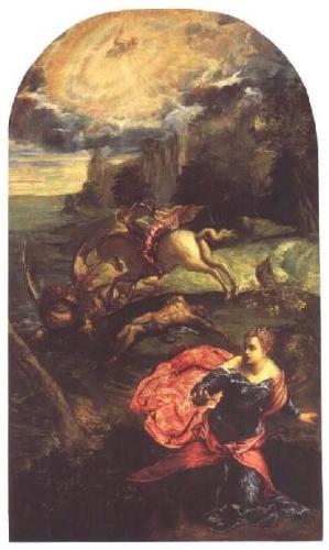 在这些16世纪后半叶的艺术家中,最伟大的一位也许是住在威尼斯的一位艺术家。他叫雅各布·罗布斯基(Jacopo Robusti),绰号丁托列托(Tintoretto, 1518-1594)。他也厌烦提香展现给威尼斯人的那种简单的形色之美,然而他的不满一定不仅仅是想创作独特的作品。他似乎已感觉到无论提香这个画家怎样无与伦比地善于表现美,他的画却倾向于媚人而不是动人:那些画并不十分激动人心,不足以使伟大的《圣经》故事和圣迹传奇生气十足地重现在我们面前。无论他这个看法是否正确,他必定还是下定决心用不同的方式去叙述那些故事,使观看的人感受到他所画的那些事件的刺激性和强烈的戏剧性。图236表现出他确实成功地画出了独特而迷人的画。乍一看这幅画显得混乱,使人茫然。跟拉斐尔等人的画法不同,主要人物不是清楚地布置在画中的平面之上,而是让我们一直看到一个奇特的拱顶深处。在左边角落里有一个高个子男人带有光环,举起手臂仿佛在制止发生的一件事情——我们顺着他的手势看去,就能看到他关注的是画面另一边拱顶之下高处发生的事情。那里有两个男人已经掀开墓盖,正要从墓里把一个尸体放下来,另一个人戴着头巾,正在帮助他们,背景中有一个贵族拿着火把,想看看另一座墓上的刻辞。这些人显然在盗窃一所地下墓穴。有一具尸体直挺挺躺在一块地毯上,是用奇特的短缩法画的,一位尊贵的老人穿着华丽的衣服跪在旁边看着尸体。画面右角有一群男女在打手势,惊讶地看着那位圣徒——带有光环的人物必定是代表一位圣徒。如果我们细看一下,就能看出他带着一本书——这是福音书作者圣马可,是威尼斯的保护圣徒。这里发生了什么事呢?原来这里画的是在威尼斯建起圣马可教堂的著名圣陵准备安放圣骨时,圣马可的圣骨怎样从亚历山大(“异教的”伊斯兰信徒的城市)运往威尼斯。据说圣马可曾在亚历山大做过主教,死后葬在那里的一所地下墓穴中。当一伙威尼斯人接受了找到圣徒遗体的虔诚使命破墓而入时,他们不知道墓穴里的那么多墓中哪一座安放着珍贵的圣骨。但在他们找到了那座墓时,圣马可突然现身指出了他在尘世生活的遗骸。这就是丁托列托所选择的时刻。圣徒指示人们不要再搜索其他的墓。他的遗体已经找到了,就躺在他的脚旁,浸沐在光线之中,遗骸的出现还产生了奇迹。在右边翻滚的那个人已摆脱掉缠住他的魔鬼,现在魔鬼好像一缕轻烟从他口中逃走。跪下来礼拜鸣谢的贵族是供养人,是宗教团体中的一员,是他委托艺术家作这幅画的。当时的人必定认为整幅画怪异。对不调和的明暗对比和远近对比,对不和谐的姿势和动作,他们可能曾感到震惊。然而他们一定很快就发现,如果使用普通的方法,丁托列托就不可能创造出这种效果,使我们觉得眼前正在展现一件极为神秘的事情。为了达到这个目的,丁托列托不惜牺牲柔和的色彩美,而那色彩美本来是威尼斯画派,是乔尔乔内和提香,最为自豪的成就。他的一幅现藏伦敦的画《圣乔治大战恶龙》(St George's fight with the dragon)(图237),表现出他怎样用奇异的光线和配合色(broken tone)加强了紧张和激动的感觉。我们觉得戏剧正当高潮。公主好像即将冲出画面朝我们奔来,而那位英雄人物却完全违反规则,被远远地移到场面的背景之中。