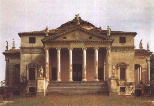 其他建筑家则比较急于显示他们有渊博的知识和精通古典著作,事实上在这方面他们确实超过了布拉曼特那一代艺术家。其中最伟大、最博学的是建筑家安德烈亚·帕拉迪奥(Andrea Palladio, 1508-1580)。图232是他的著名的Villa Rotonda即圆厅别墅,在维琴察(Vicenza)附近。这在一定程度上也是一个“随想曲”,因为它四面相同,每一面都有一个跟神庙立面形式相同的有柱的门廊,四面合起来围着中央大厅,那大厅令人回想起罗马的万神庙(见120页,图75)。无论这种结合怎样美,它却很难成为一座人们乐于居住的建筑。寻求新奇性和外观效果已经干扰了建筑物的正常用途。