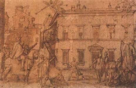 年迈的米开朗琪罗正羡慕地望着在一座府邸的脚手架上工作的塔代奥·祖卡罗,名誉女神吹起喇叭向全世界宣告祖卡罗的胜利