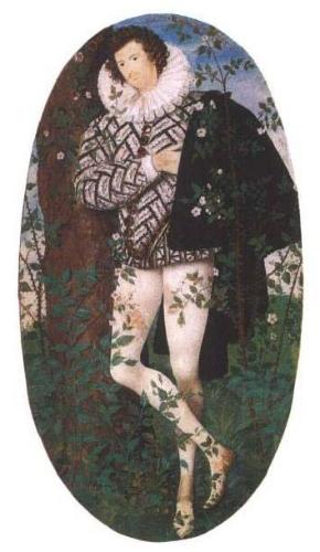 伊丽莎白时代的一位年轻贵族的肖像(图244)可以使我们了解这一种新型肖像画法的最佳之作。这是跟锡德尼(Sidney)和莎士比亚同代的英国名家尼古拉斯·希利亚德(Nicholas Hilliard, 1547-1619)画的一幅“细密画”。看着这位优雅的青年,他右手放在胸前,懒洋洋地倚在一棵树上,周围是带刺的野玫瑰,我们确实可能想起锡德尼的田园诗歌或莎士比亚的喜剧。大概,这幅细密画是那位青年男子打算送给他正在追求的女子的一件礼物,因为上面有拉丁文题词“Dat poenas laudata fides”(皎皎诚意,自贻伊戚),意思大致是“我的可赞美的诚意使我痛苦”。我们不便追问那些痛苦到底是不是比这幅细密画上画的玫瑰刺更真实一些。在那些年代里,就是期望着一个求爱的青年表现出悲伤和单恋来。那些叹息和那些十四行诗都是一种优美、精巧的游戏的一部分,没有一个人会认真对待,但是人人都想在这个游戏中,发明出新的花样和新的优雅之举使自己超群出众。