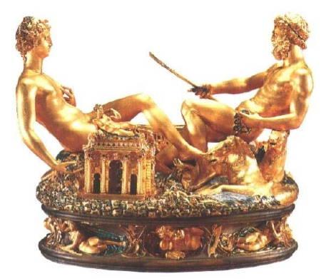 这个时期有一位典型的艺术家是佛罗伦萨的雕刻家兼金匠本韦努托·切利尼(Benvenuto Cellini, 1500-1571)。切利尼在一本名著中描写过他自己的生平,那本书丰富多彩、生动活泼地描绘了他的时代。他爱说大话,冷酷而自负,但很难跟他生气;因为他叙述自己的冒险和成功的经历时兴致勃勃,使你觉得仿佛在读大仲马(Dumas)的小说。他爱虚荣、自命不凡而且坐不住,这就驱使他从这个城市到那个城市,从这个宫廷到那个宫廷,到处惹是非,捞荣誉,真是那个时代的典型产物。对于他来说,艺术家已经不再是一个稳重而可敬的作坊主,应该是君主和红衣主教们争相邀宠的“艺术巨匠”。他的作品流传下来的很少,其中有一件是1543年为法国国王制作的金制盐盒(图233)。切利尼详详细细地告诉了我们盐盒的故事。我们听到他是怎样斥退了两位胆敢给他推荐题材的著名学者,他又是怎样用蜡制作了一个他自己构思的模型,代表大地和大海。为了表现出大地和大海相互接合,他把两个人物形象的腿联结在一起;他说,“大海被塑造为男人,控制着一条精致的船,船里能够装上足够的盐,在下面我放上四只海马,而且我给大海加上一把三叉戟。我把大地塑造为美女,尽我所能使她优雅可人。在她身边,我放上一座装饰富丽的神庙来盛胡椒。”然而这一切微妙的设计读起来不如他运黄金的故事有趣,书中叙述了他怎样从国王的宝库里运走黄金,途中遭到四个歹徒的袭击,他只身一人把他们全部打跑。我们有些人可能觉得,切利尼的人物形象的圆滑宜人之美显得有些刻意求工,虚伪造作。但是,一旦知道创作那些形象的艺术家原来是这样孔武有力,并不像他的作品那样似乎缺乏强健的体魄,或许也是会得到安慰的。