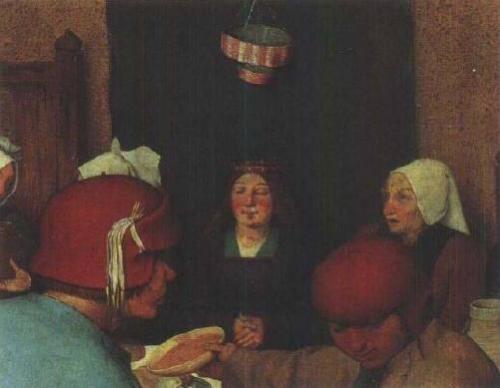 勃鲁盖尔最完美的人间喜剧之一是他的一幅著名的《乡村婚宴图》(图246)。像大多数绘画作品一样,它在复制品中严重失真:局部细节都大大缩小,因此我们观看时就不得不加倍小心。宴会设在一座仓房里,稻草高高地堆积在背景中,新娘坐在一块蓝布前面,在她的头顶上方悬挂着一种花冠。她双手交叉平静地坐在那里,愚蠢的脸上露出十分满意的笑容(图247)。椅子上坐着的老头和新娘身边的女人大概是新娘的父母,更靠里面正拿着汤匙狼吞虎咽忙着吃饭的男人可能是新郎。席上的人们大都只顾吃喝,而我们注意到这还仅仅是个开始。左边角落里有个男人在斟酒——篮子里还有一大堆空罐子——还有两个系着白围裙的男人抬着临时凑合的木托,上面放着十盘肉饼或是粥。一位客人把盘子向餐桌上递过去。然而此外还有许多事情正在进行。背景中有一群人想进来;还有一批吹鼓手,其中的一个在注视着抬过去的食物,眼睛里流露出一种可怜、凄凉、饥饿的神色;餐桌角上有两个局外人,是修道士和地方官,正在聚精会神地谈话;前景中有一个孩子,小小的头上却戴着一顶插着羽毛的大帽子,手里抓着一只盘子,正在全神贯注地舔吃那香喷喷的食物——一幅天真贪婪的样子。但是跟所有这一切丰富的趣事、才智和观察相比,更值得赞扬的是勃鲁盖尔使画面避免了拥挤和混乱的组织画面的方式,连丁托列托也不可能把这样一种挤满人群的空间画得比勃鲁盖尔所画的更为真实可信了。勃鲁盖尔使用的手段是,让餐桌向后延伸到背景中去,人们的动作从仓房门旁的人群开始,一直导向前景和抬食物的人的场面,然后再向后通过照料餐桌的那个男人的姿势,把我们的眼睛直接引向形象虽小、地位重要的人物,那是正在咧着嘴笑的新娘。
